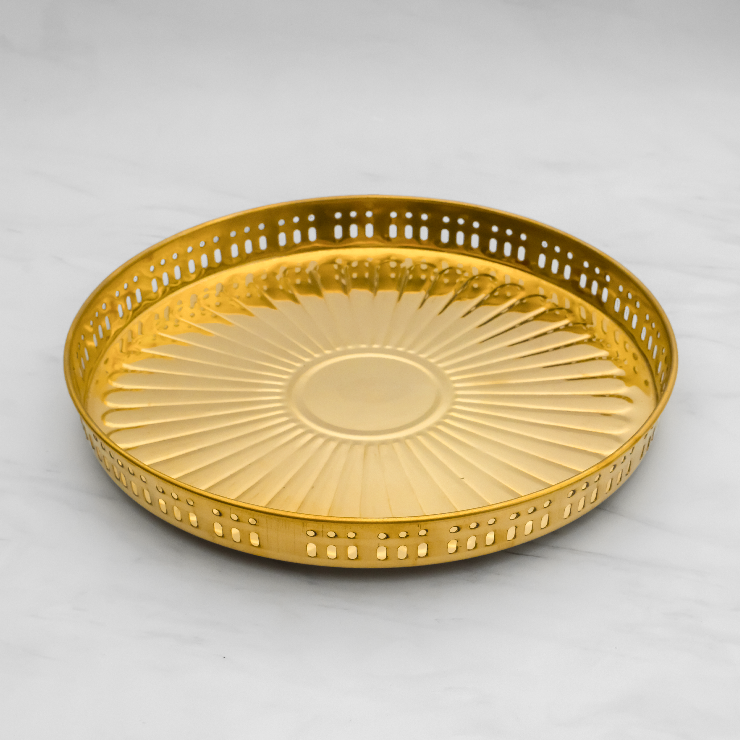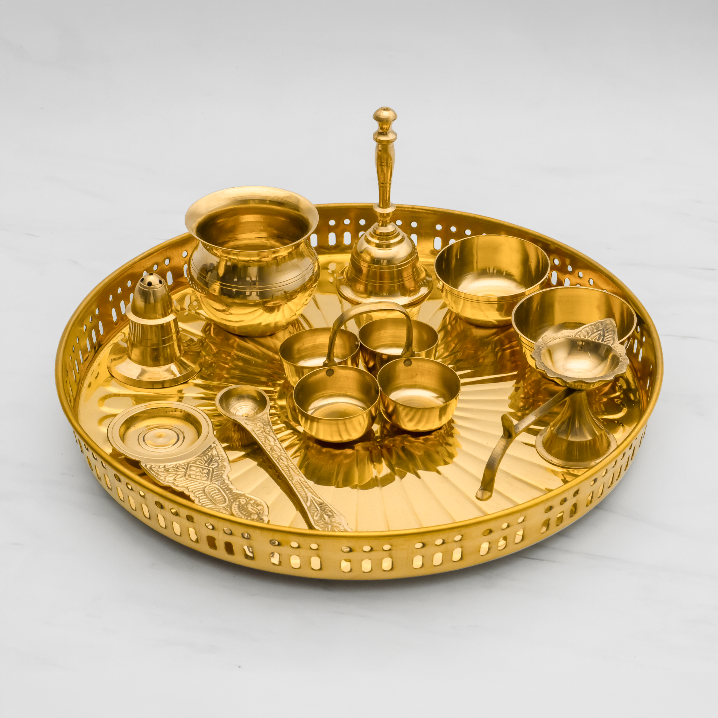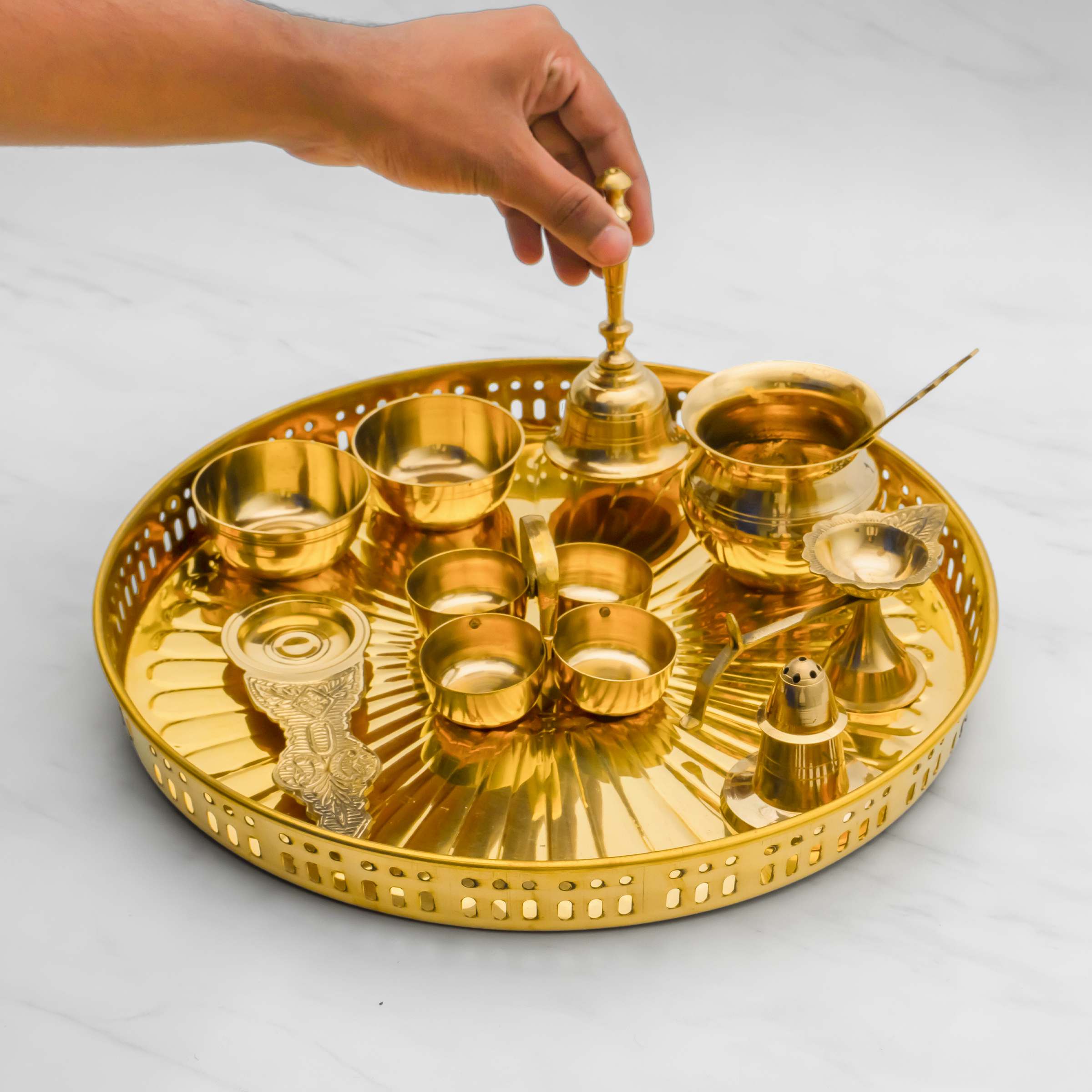 xHealthsmith's Best Quality Pure Brass Pooja Thali Set Enrich your spiritual rites and rituals with this well carved Brass Pooja Thali, an exquisite item that skillfully blends tradition and style. Our Brass Pooja Thali is more than a functional item; it represents dedication, craftsmanship, and tradition. This beautiful piece enhances your worship and creates a sacred atmosphere in your home.