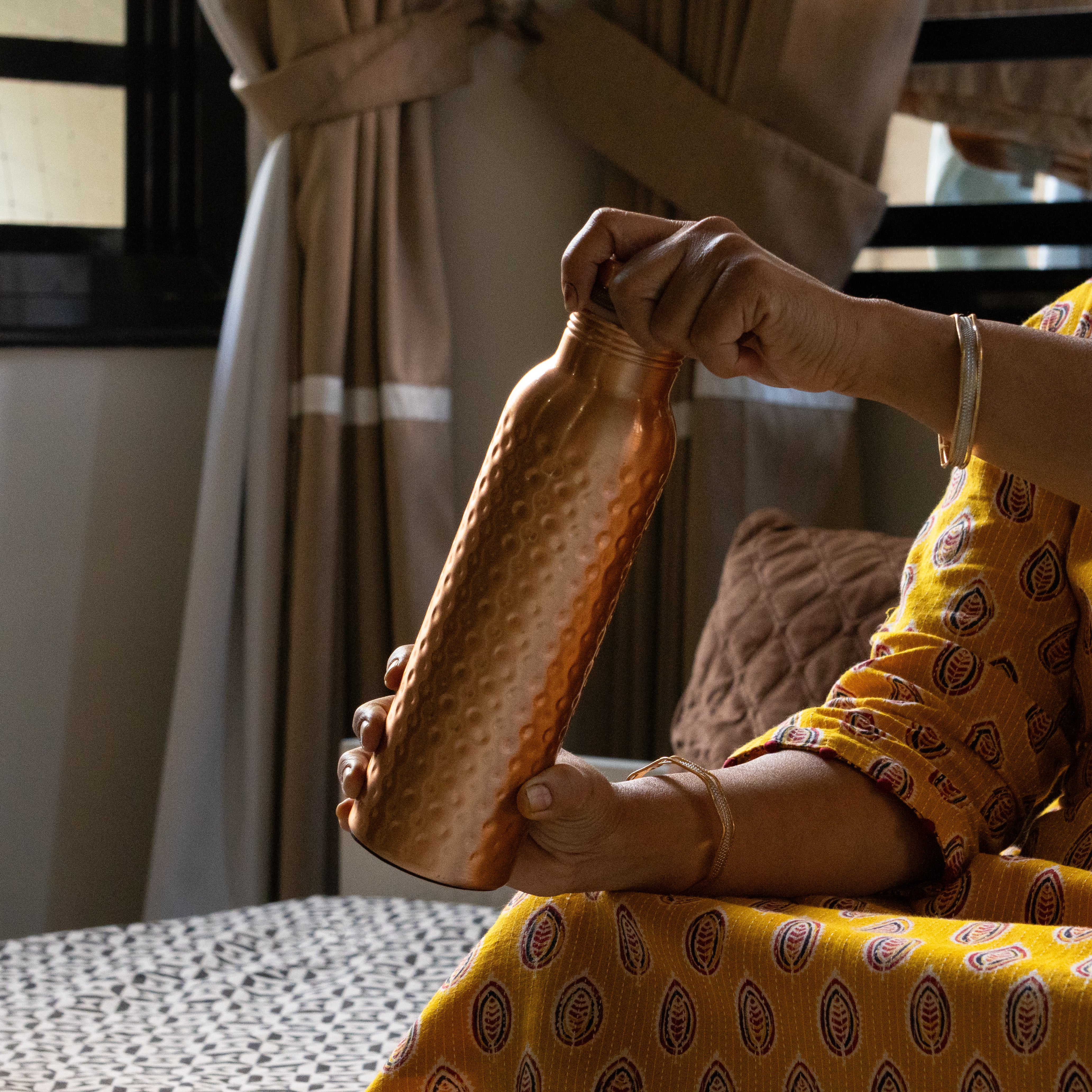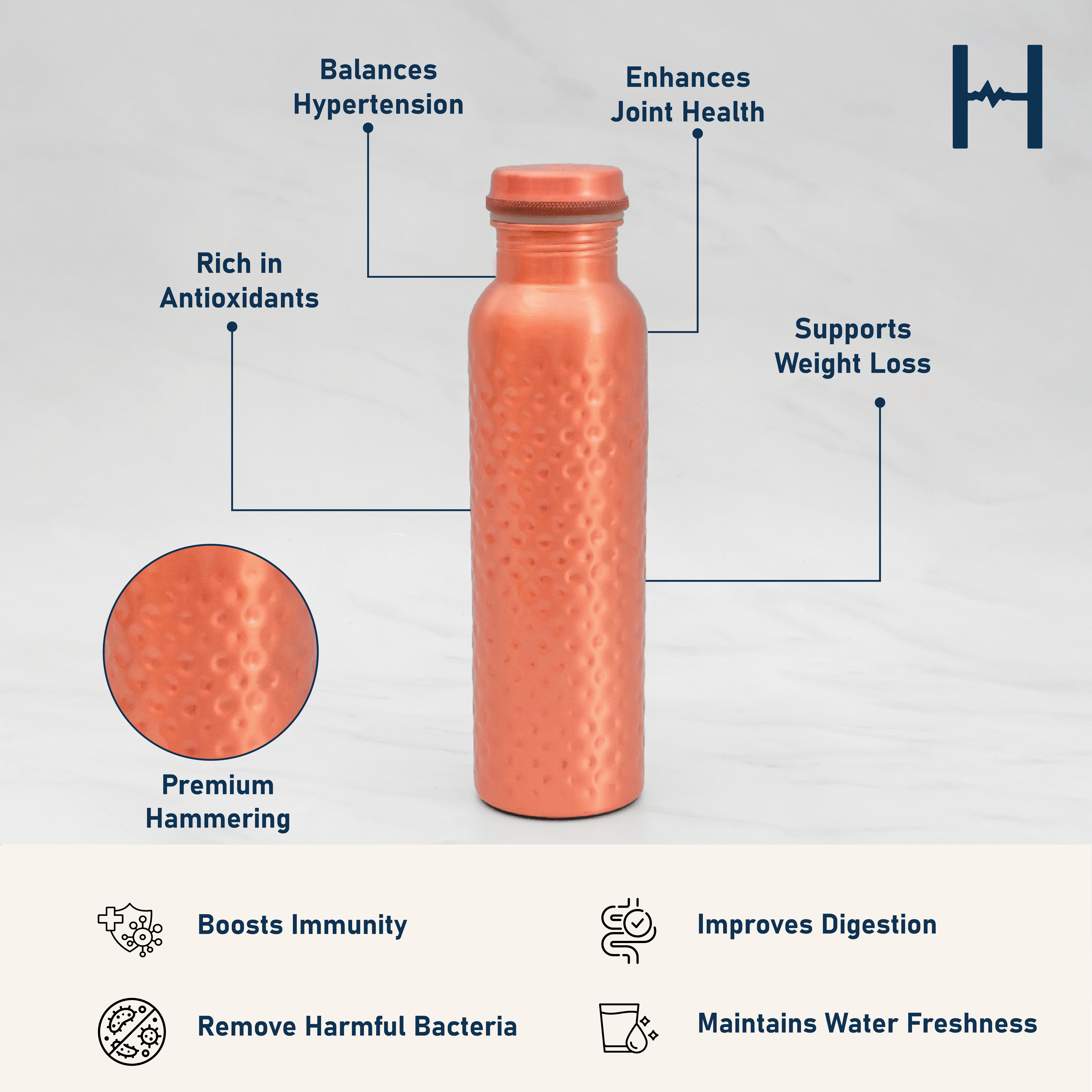 xExperience timeless elegance with our Copper Water Bottle (Hammered) by Healthsmith, carefully crafted to combine style with health-enhancing properties. Made from high-quality copper, this durable bottle boasts natural antimicrobial properties, ensuring that each sip is refreshing and safe for consumption.