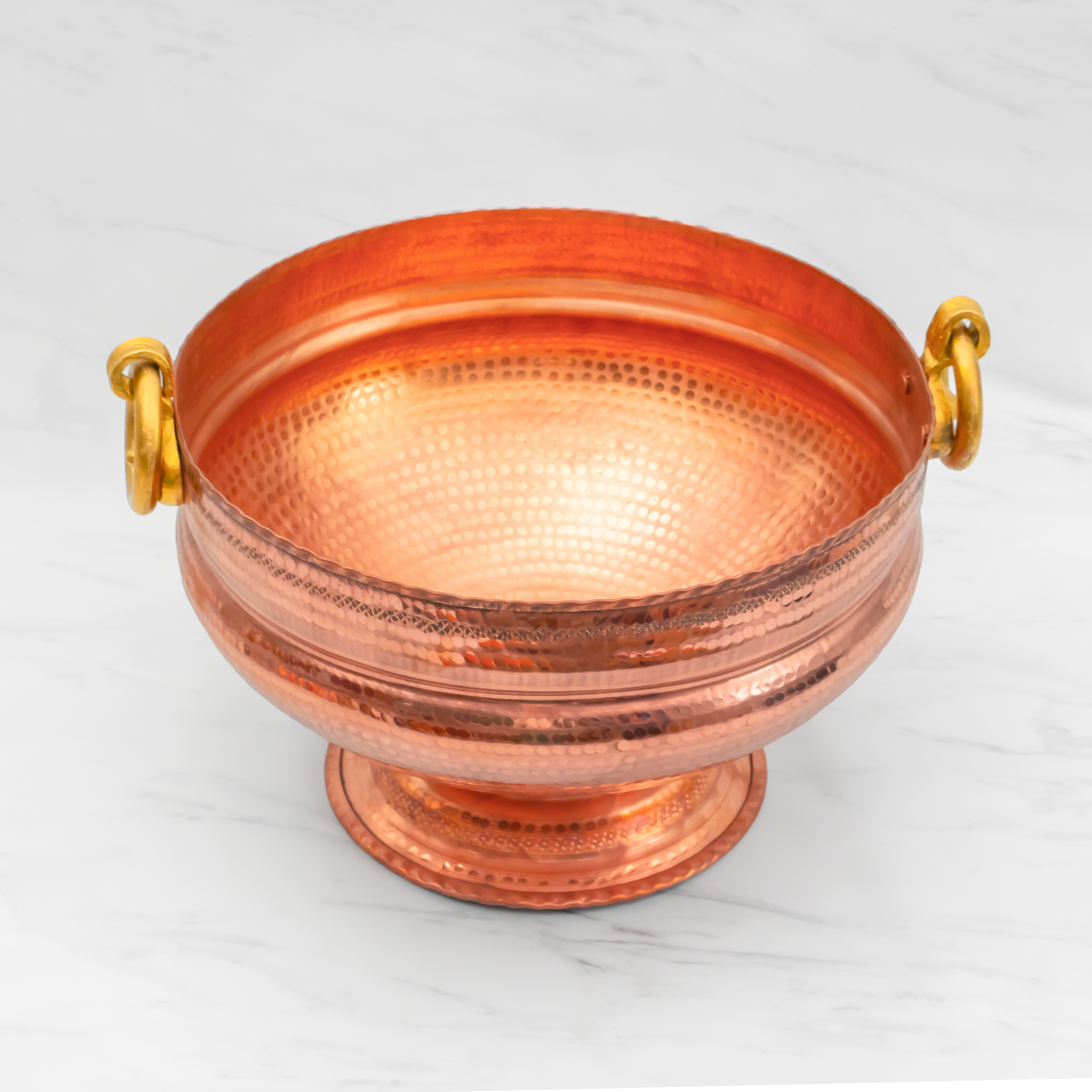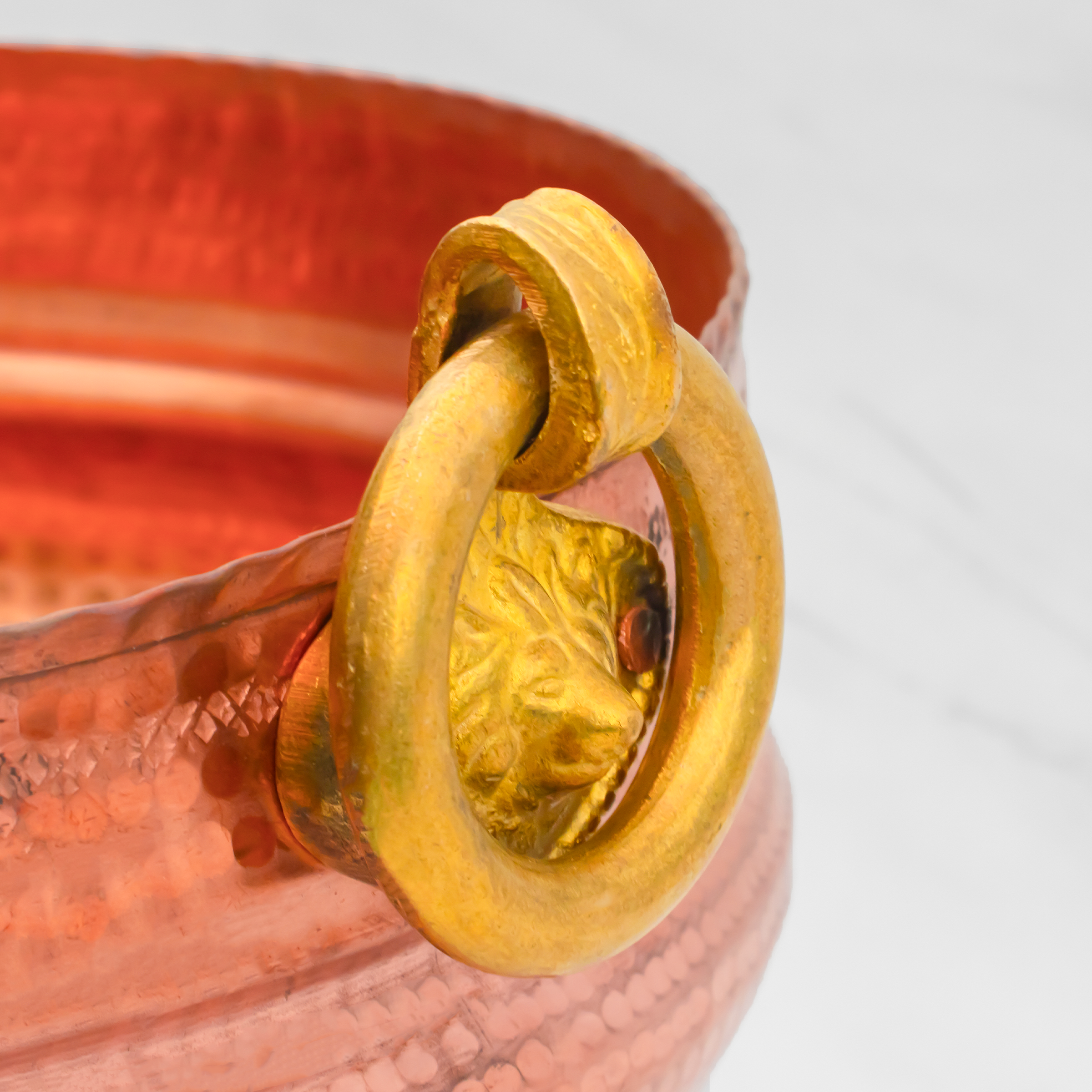 xThe Copper Ghangal, with its elegant and timeless design, is a versatile piece equally celebrated for its decorative appeal. Crafted from high-quality copper, this Ghangal features a hammered finish that enhances its visual texture, complemented by sturdy handles with intricate detailing.