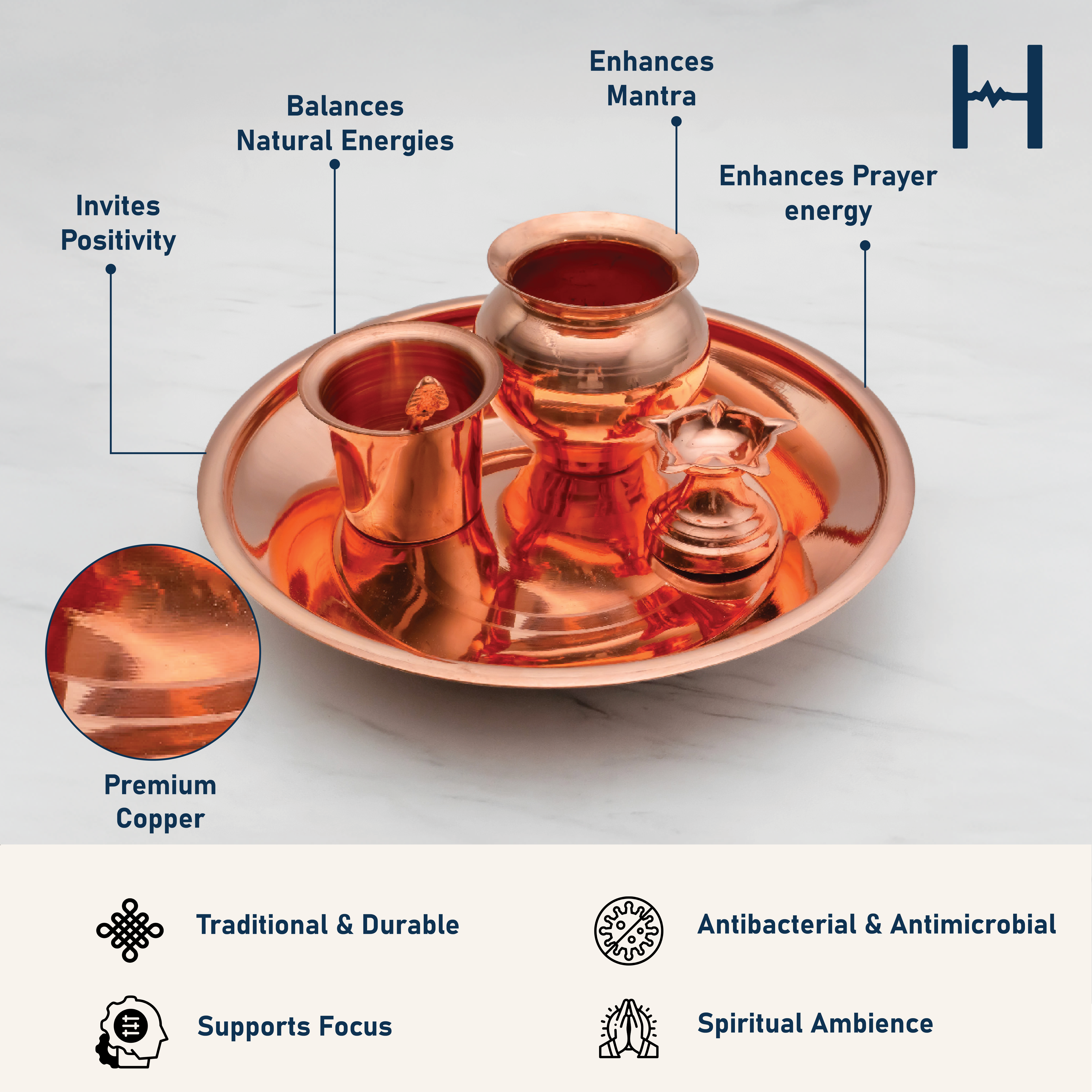 xIntroducing Healthsmith's Best Quality Pure Copper 5 Item Pooja Thali Set. Enrich your spiritual rituals with this beautifully crafted Copper Pooja Thali, which seamlessly blends tradition with elegance. This set includes five essential items for your pooja, each crafted with precision and care.