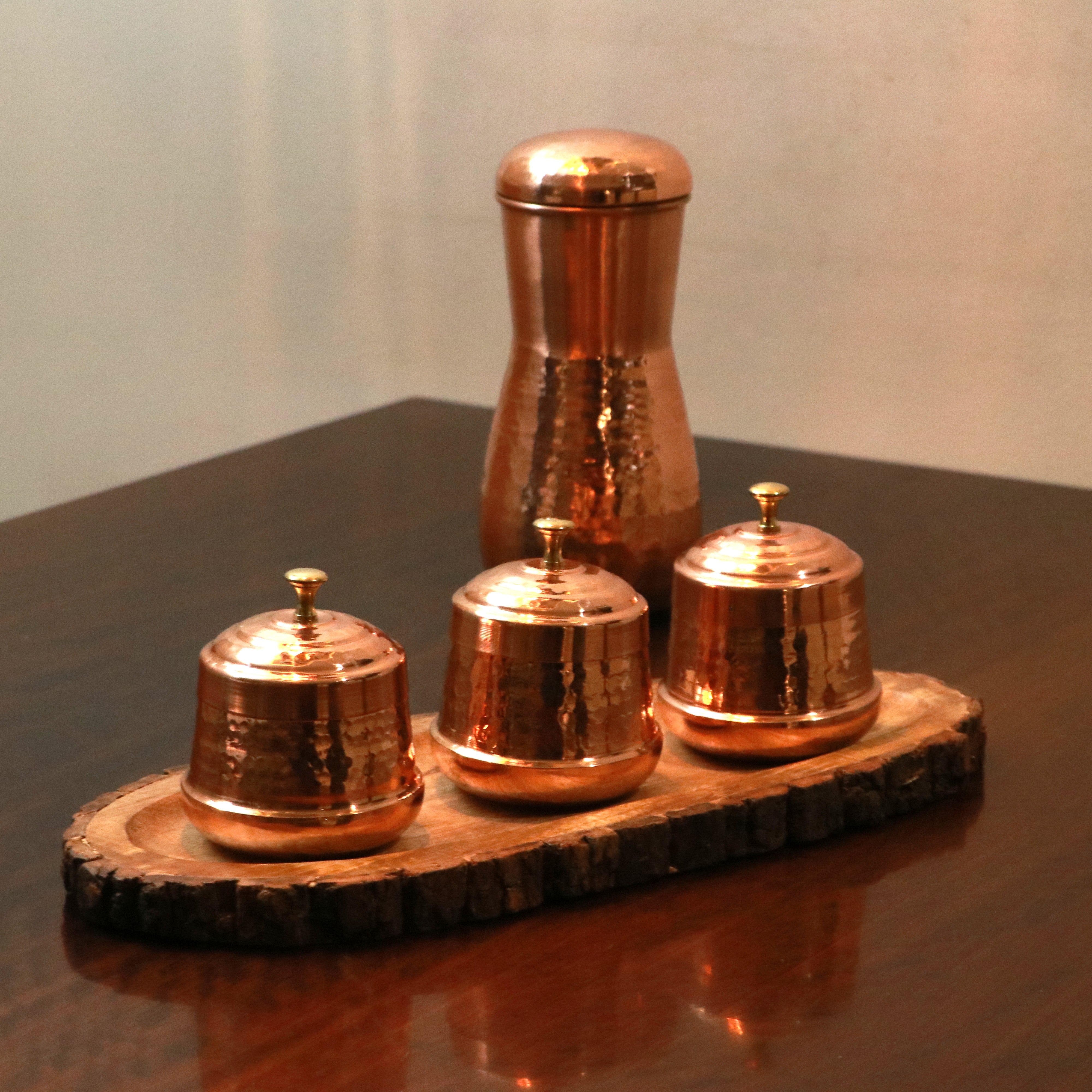 xThis image showcases a beautifully designed copper set consisting of three dry fruit jars. Each jar is elegantly crafted with a hammered texture, giving it a traditional yet sophisticated look. The jars feature golden-hued lids with a simple, sleek knob for easy access. They are placed on a polished copper tray that complements the set, enhancing its visual appeal. The combination of the shiny copper finish and the rustic hammered pattern gives the set a luxurious, timeless feel, perfect for serving dry fruits or snacks in an upscale setting or during special occasions.