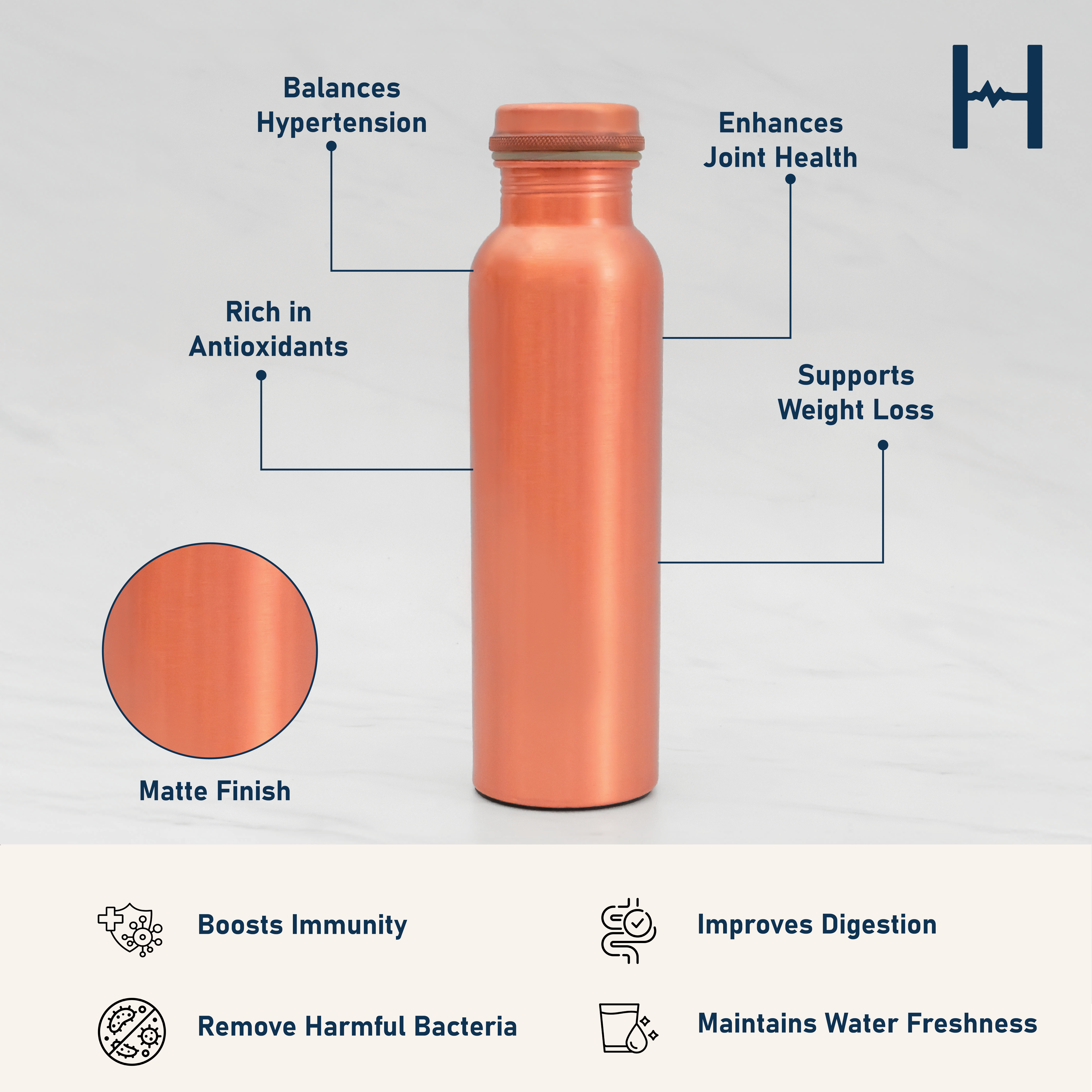 xSay goodbye to ordinary water bottles and embrace the sophisticated Matte Copper Bottle by Healthsmith. This premium bottle is made from pure copper, renowned for its natural ability to keep water fresh and free from harmful microbes. The matte finish gives it a contemporary edge, making it not just a vessel for hydration but a statement of style.
